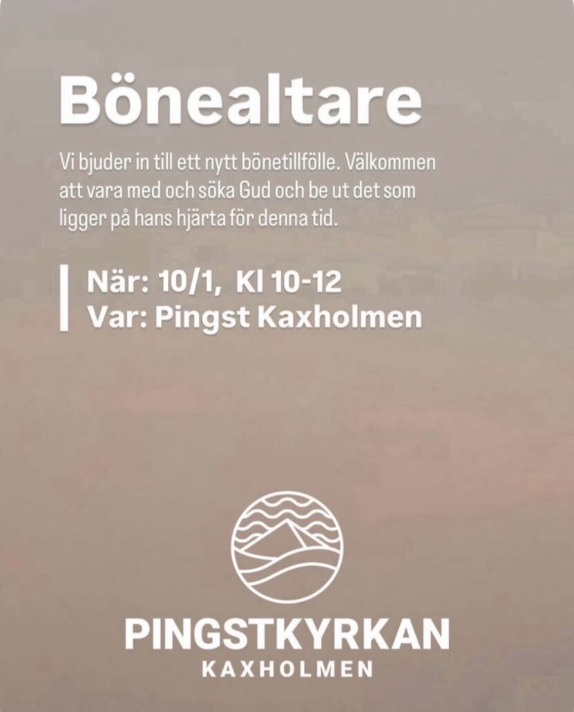Vi ses i kyrkan varje måndag kl. 08.00 och varje onsdag kl. 19.00 för att be och lovsjunga tillsammans. Vi ses även till bön på lördagar kl 10-12 en gång i månaden Välkommen att vara med!
